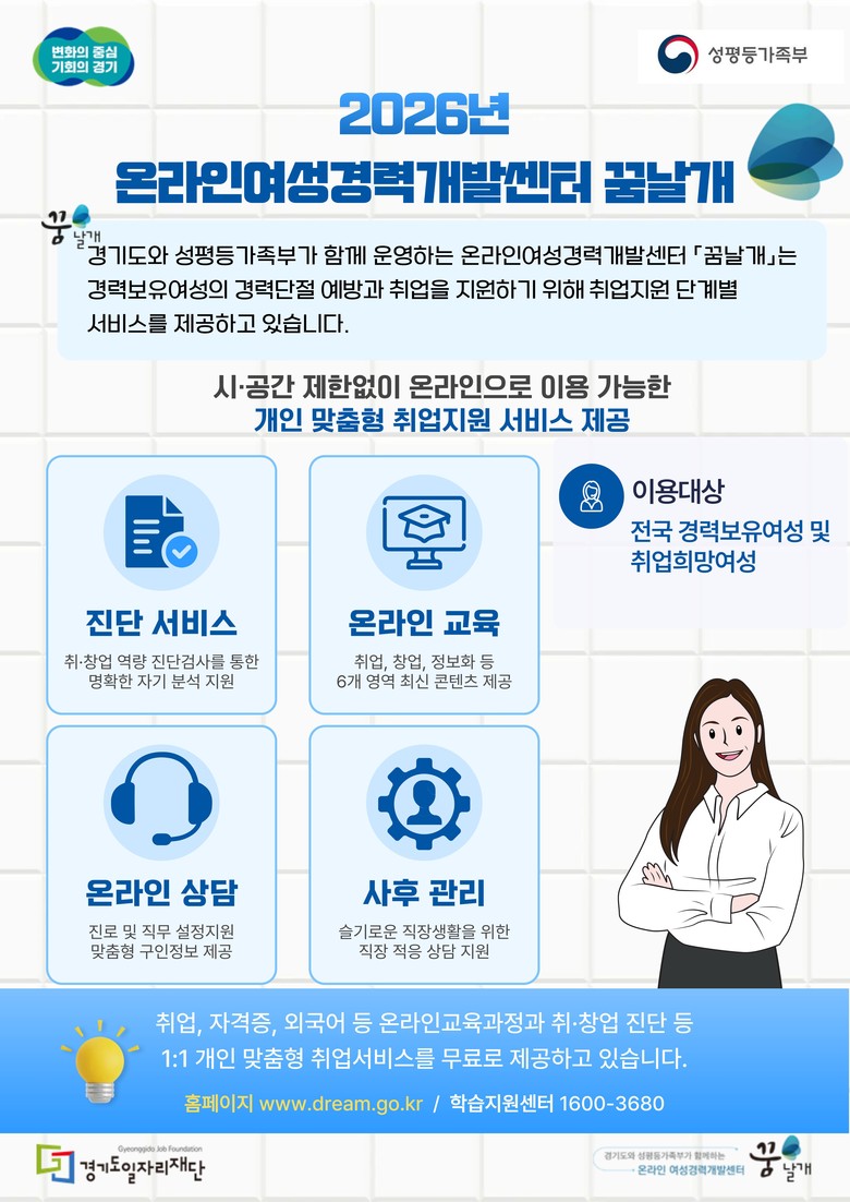 온라인 여성경력개발센터(꿈날개)는 국비사업으로, 시간과 장소의 제약 없이 이용할 수 있는 원스톱 취업지원 플랫폼이다. 온라인에서 취업진단·교육·상담 등 개인별 맞춤형 경력개발 서비스를 제공한다.