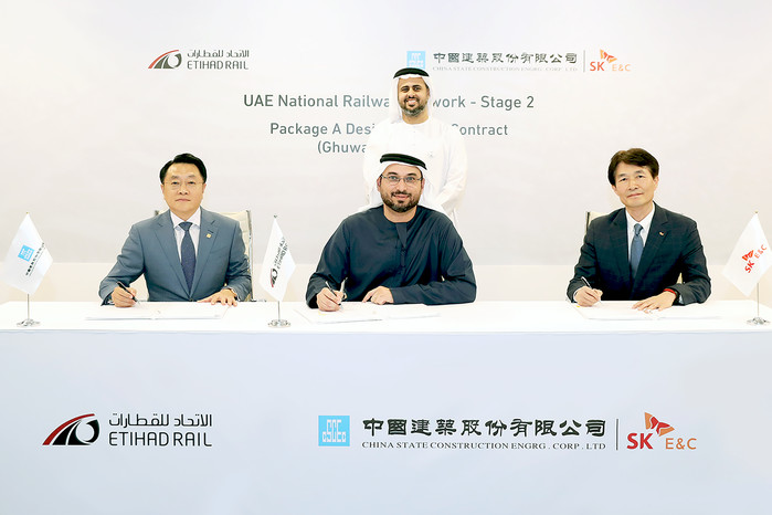SK건설은 UAE의 에티하드 레일(Etihad Rail)이 발주한 2단계 철도망 건설사업 중 구웨이파트(Ghweifat)~루와이스(Ruwais) 구간에 대한 공사계약을 체결했다고 13일 밝혔다. 이로써 국내 건설사 최초로 사우디, 쿠웨이트 등 걸프협력회의(GCC) 회원국의 철도 프로젝트에 참여하게 됐다.