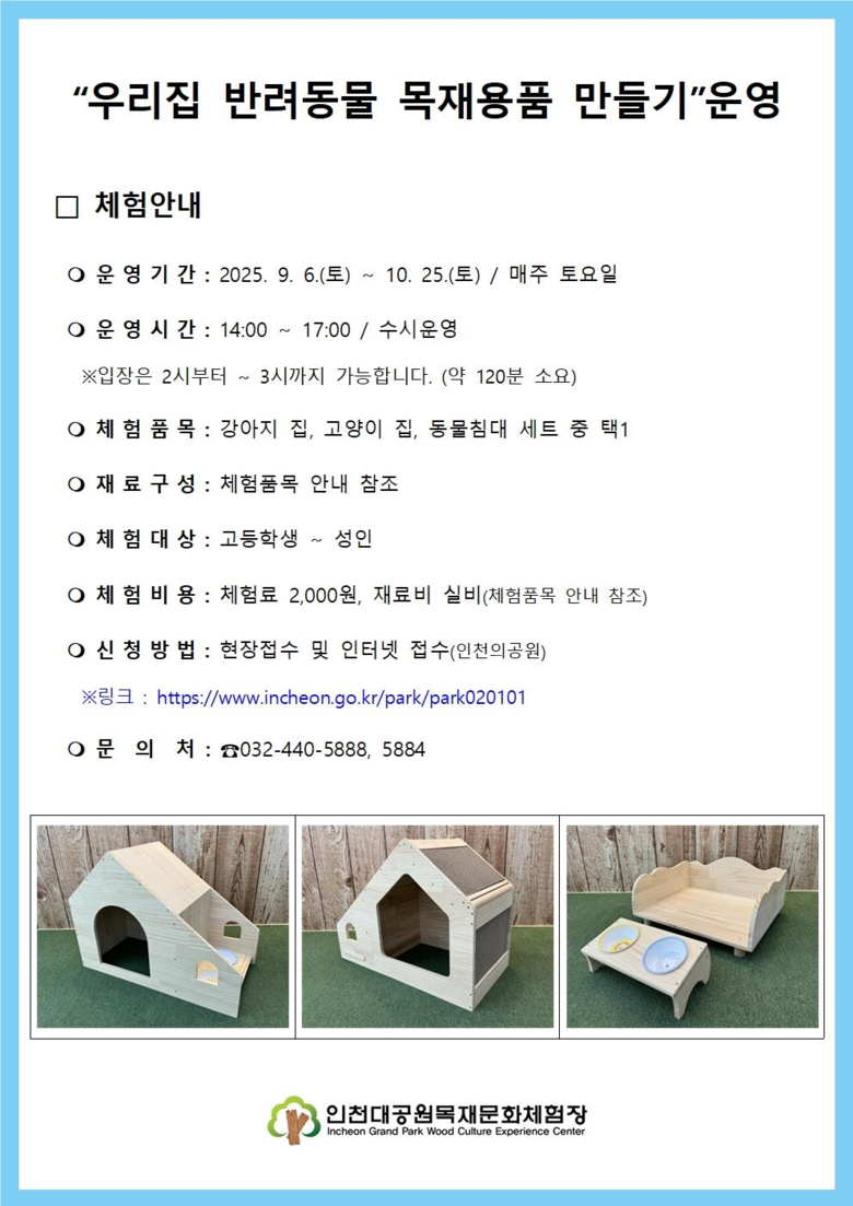 [인천 세계타임즈=심하린 기자] 인천광역시(시장 유정복) 인천대공원사업소는 반려동물을 사랑하는 시민들을 위해 맞춤형 목공 체험 프로그램을 마련하고, 오는 9월 6일부터 10월 25일까지 매주 토요일 ‘우리집 반려동물 목재용품 만들기’ 체험을 운영한다고 밝혔다.