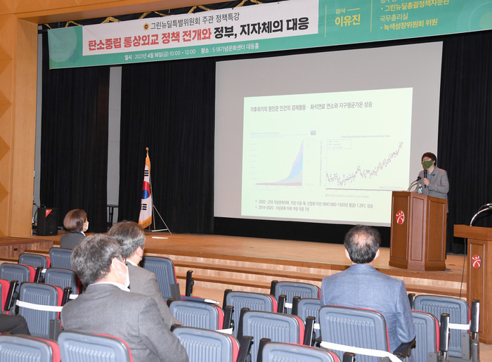 이번 특강은 2050 탄소중립을 선언한 한국사회의 직면한 과제를 살펴보고 광주의 그린뉴딜을 방향을 모색하기 위해 마련됐으며, 광주시‧자치구‧교육청 간부 공직자들과 공사공단 및 출자출연기관의 임직원이 참석했다.