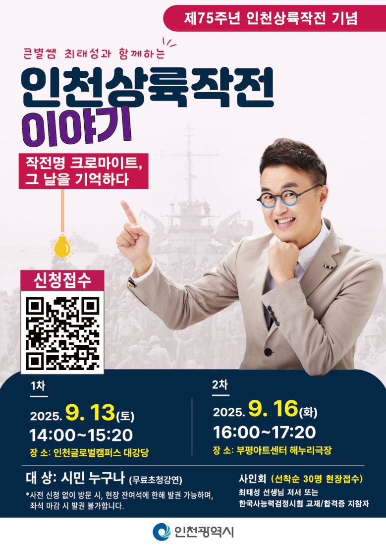 - 9.13.(토) 인천글로벌캠퍼스, 9.16.(화) 부평아트센터 - [인천 세계타임즈=심하린 기자] 인천광역시(시장 유정복)는 인천상륙작전 75주년을 기념해 대한민국 대표 한국사 강사 큰별쌤 최태성과 함께하는‘작전명 크로마이트, 그날을 기억하다’를 개최한다고 밝혔다.