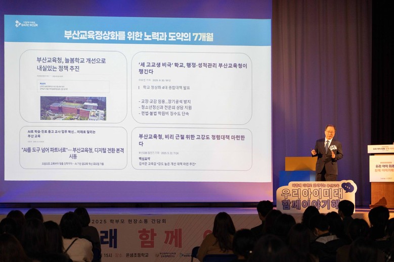 김석준 교육감은 부산교육청의 주요 정책 추진과제로 AI 융합교육, 기초학력 보장 맞춤교육, 교육활동을 보호하는 안전한 학교 조성과 민주시민을 양성하는 시민교육을 설명하며 “교육 정책은 학부모와 함께 만들어 가야 한다”고 강조했다.