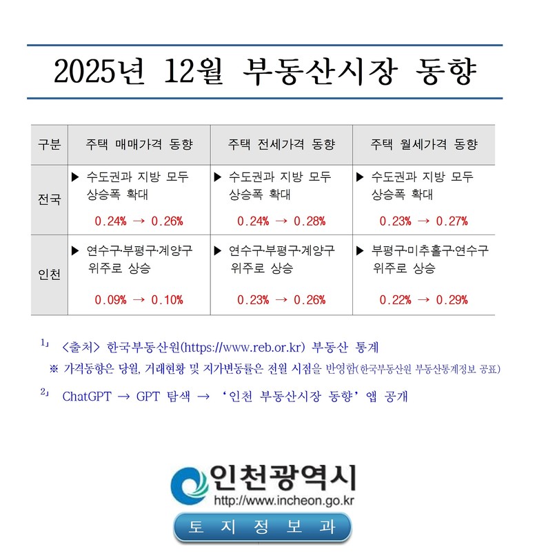 한편, 인천시는 시민들이 부동산 시장 동향을 보다 쉽고 편리하게 확인할 수 있도록 생성형 인공지능 서비스인 ‘챗지피티(ChatGPT)’ 기반의 ‘인천 부동산시장 동향’ 앱을 통해 지역별 주택 매매 및 전‧월세 가격 변동률, 거래량, 아파트 매매‧전‧월세‧분양‧입주권 실거래가 등을 실시간 맞춤형 대화 방식으로 제공하고 있다.