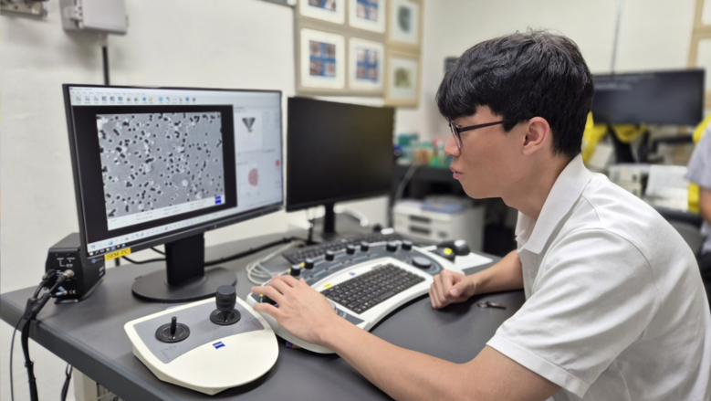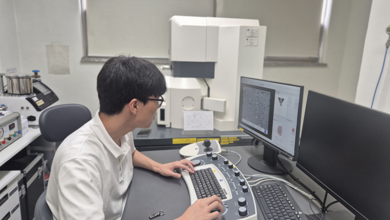 | ▲ 인턴십에 참여한 이영한 학생이 주사전자현미경 실험기기를 사용해 초미세먼지 형상을 분석하고 있다. |