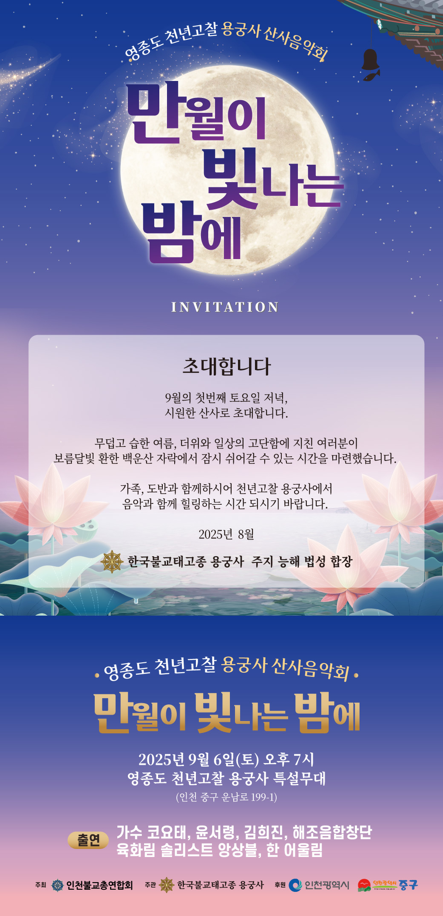 윤도영 시 문화체육국장은 “천년고찰 용궁사에서 달빛과 음악이 어우러지는 특별한 무대를 시민들에게 선보일 수 있어 뜻깊다”라며, “이번 음악회가 인천의 문화적 품격을 높이고 시민들의 일상에 치유와 기쁨을 더해주기를 바란다”라고 말했다.