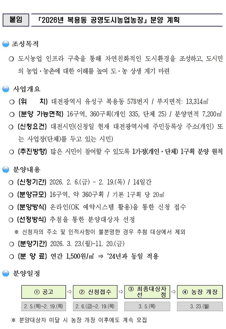 신청은 ‘대전광역시 OK 예약서비스’(www.daejeon.go.kr/okr)를 통해 가능하며, 1세대(또는 단체)당 1구획(구획당 20㎡) 신청이 원칙이다.