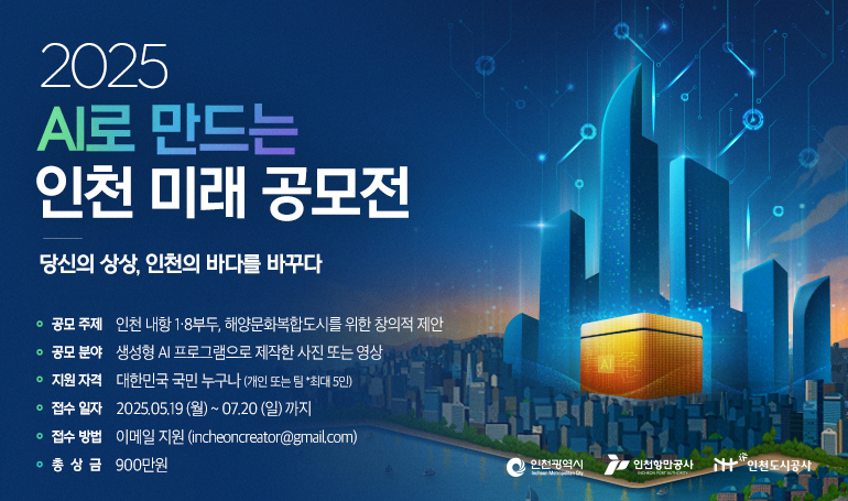 - “AI 활용 이미지·영상 공모전… 수상작은 전광판·SNS 통해 공개” - [인천 세계타임즈=심하린 기자] 인천광역시(시장 유정복)는 인공지능(AI)을 활용해 시민이 직접 인천의 미래 항만 도시를 그려낸 ‘2025 AI로 만드는 인천 미래 공모전’의 수상작 6편을 8월 7일 발표했다.