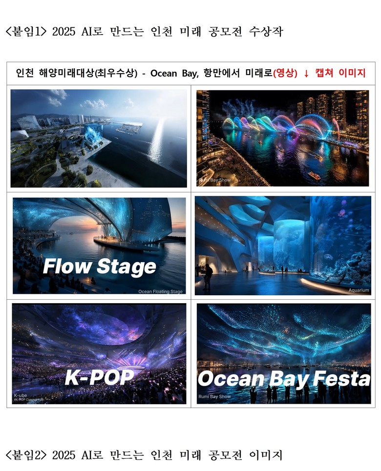 이번 공모전은 인천시가 인천항만공사·인천도시공사와 공동으로 개최했으며 인천 내항 1·8 부두를 문화·관광·상업·주거가 어우러진 해양문화복합도시로 재창조하기 위한 시민들의 창의적인 아이디어를 인공지능(AI) 기술로 표현하도록 기획됐다.
