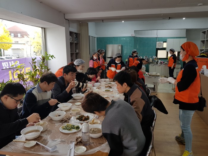 이날 삼계탕 봉사에는 유희자 단장을 비롯한 회원15명이 삼계탕, 닭죽, 묵무침, 부침개를 준비하여 50명의 발달장애인들에게 점심식사를 대접하였다.