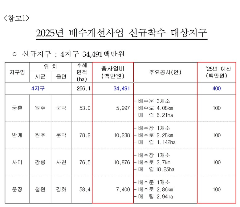 이와 별도로, 2025년 계속지구로 추진 중인 배수개선사업 11개 사업에도 국비 152억 원을 투입하여 진행 중이며, 2027년까지 마무리할 계획이다.