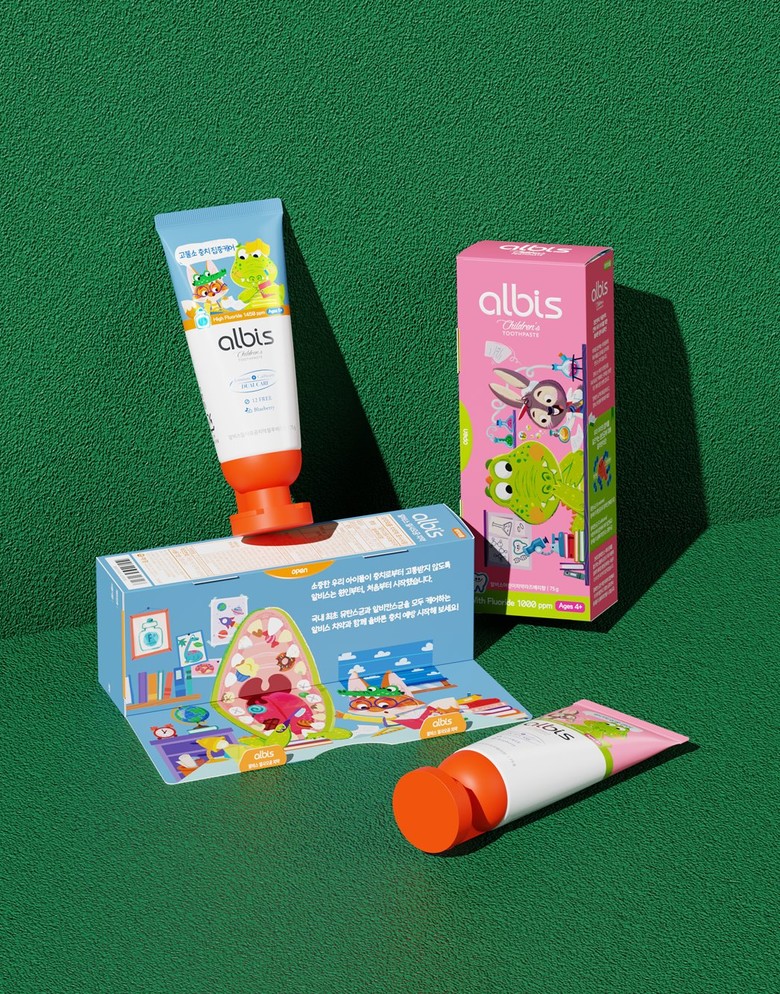 알비스 어린이 불소 치약은 양치를 어려워하는 아이들도 양치에 대한 흥미를 느낄 수 있도록 동화책처럼 펼쳐지는 단상자에 귀여운 캐릭터가 충치의 원인과 예방에 대해 이야기해 주는 콘셉트를 적용해 아이들이 올바른 치아 관리에 대해 쉽고 친숙하게 이해할 수 있도록 했다.