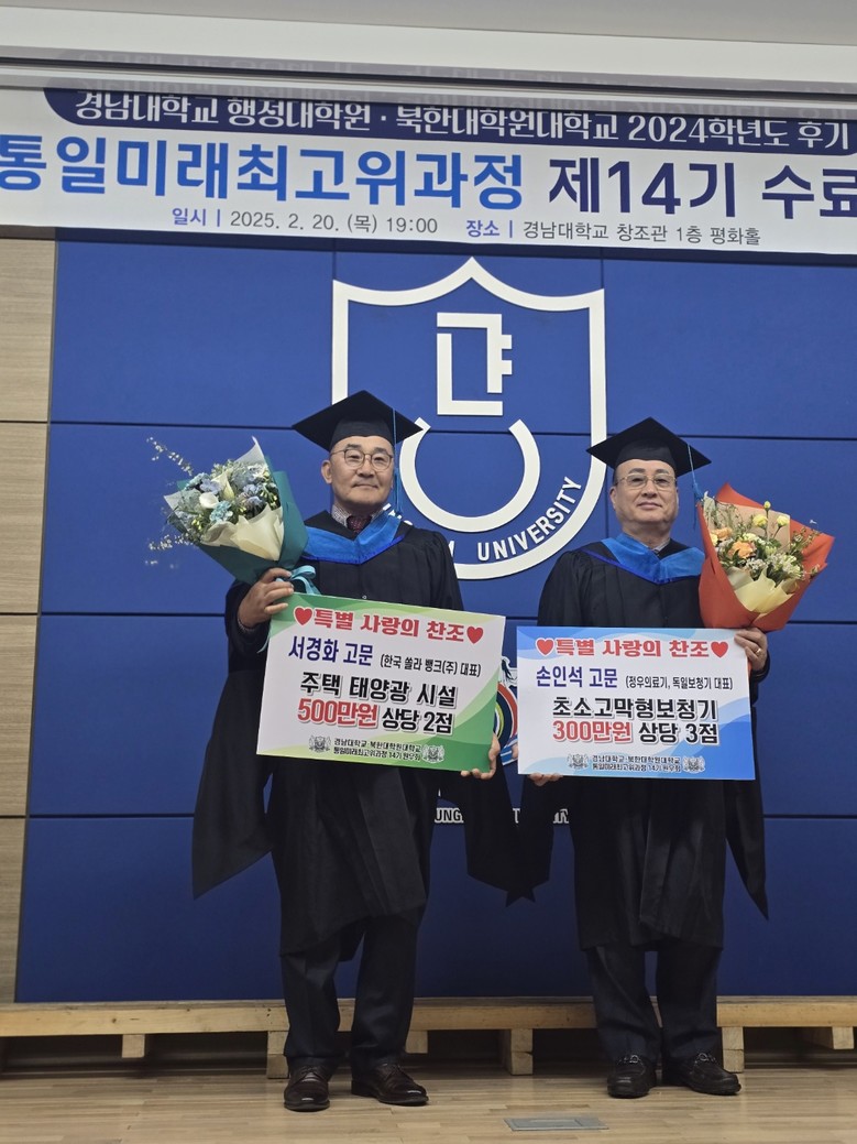 [세계타임즈] 최성룡기자 =경남대학교 북한 · 통일 분야에서 오랜 역사와 탁월한 업적으로 명실상부 최고의 권위를 지닌 연구·교육기관 『경남대학교-북한대학원 대학교』가 공동으로 운영하는 『통일 미래 최고위 과정』제14기 수료식을 2월20일 7시 창조관 1층 평화의 홀에서 가졌다.