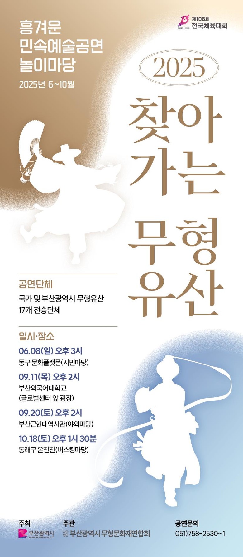 ◈ ▲동구 문화플랫폼 시민마당(6.8. 15:00) ▲부산외국어대학교 글로벌센터 앞 광장(9.11. 14:00) ▲부산근현대역사관 야외마당(9.20. 14:00) ▲동래구 온천천 버스킹마당(10.18. 13:30)… 공연은 무료 관람 가능 [부산 세계타임즈=이용우 기자] 부산시(시장 박형준)는 무형유산 전통 민속예술의 가치를 확산하고, 신명 나고 흥겨운 전통 민속예술 공연으로 시민들의 삶에 활력을 불어넣기 위해 「2025 찾아가는 무형유산」 '전통민속예술공연 놀이마당'을 개최한다고 밝혔다.