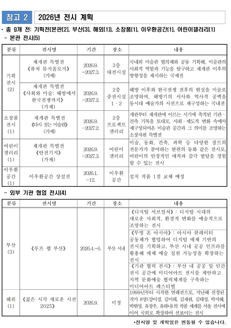 미술관의 역사를 돌아보는 전시도 개최한다. 《다시 짓는 미술관》(가제)은 개관부터 재개관에 이르기까지 축적된 기관·건축 기록을 바탕으로, 사회·제도적 변화 속에서 재구성되어 온 미술관 공간과 의미를 조명하는 소장자원 특별전이다.
