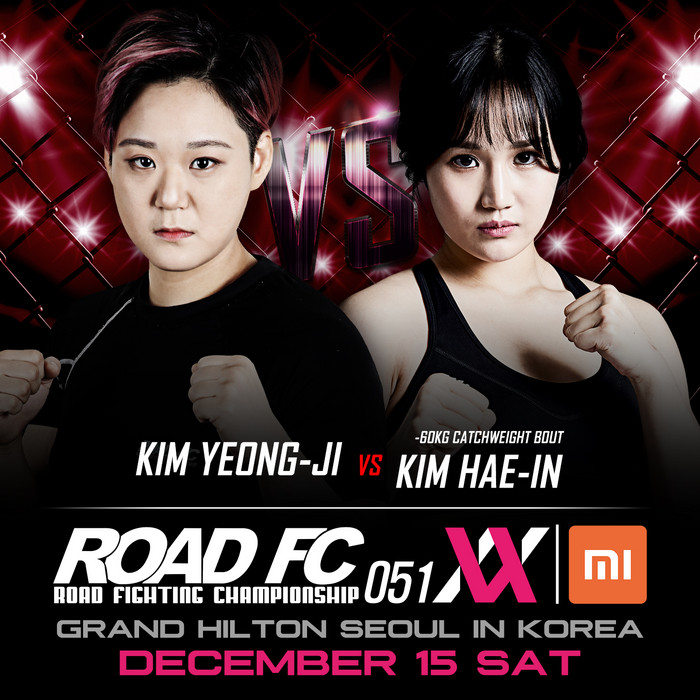 [세계타임즈 김인수기자] ROAD FC (로드FC)는 12월 15일 그랜드 힐튼 서울에서 XIAOMI ROAD FC 051XX를 개최한다. 세계랭킹 1위의 ‘아톰급 챔피언’ 함서희(31, 팀매드)와 ‘몬스터 울프’ 박정은(22, 팀 스트롱울프)이 대결하는 타이틀전이 메인 이벤트로 결정됐고, 이예지(19, 팀 제이)와 ‘꽃미녀 파이터’ 이수연(24, 로드짐 강남MMA), ‘케이지의 악녀’ 홍윤하(29, 송탄MMA 멀티짐)와 백현주(20, 광주승리짐)의 대결이 발표된 상황이다. 여기에 추가로 김영지와 김해인의 대결도 확정됐다.