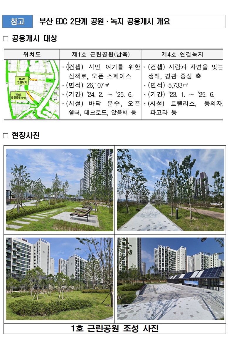 이번 공용개시 대상은 에코델타시티 2단계 사업구역 내 1호 근린공원(남측)과 4호 연결녹지(서측) 일부 공간으로, 폭염 속 시민 쉼터 제공을 위한 녹지와 분수 공간 등을 준공 전에 우선 개방한다. 규모는 총 3만1천840제곱미터(㎡)다.