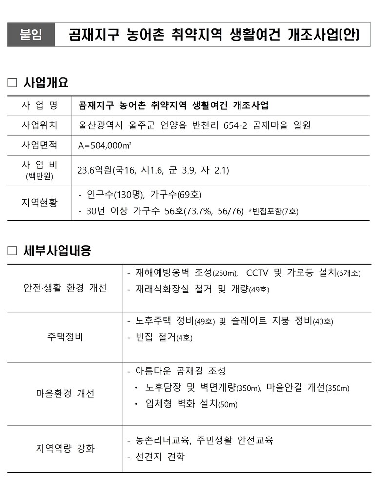 울산시 관계자는 “이번 공모사업 선정을 통해 농촌 지역의 실질적인 주거 복지와 안전 기반을 마련할 수 있는 실질적인 추진동력을 확보했다며” 앞으로 중앙 공모에 지속 도전해 농어촌지역 생활여건 개선을 확대해 나갈 계획이다”라고 말했다.