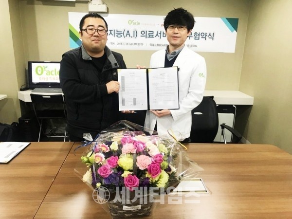 오라클메디컬그룹(회장 노영우)과 웨저(대표 박해유)가 26일 인공지능 의료서비스에 대한 MOU를 체결했다. 양 기관은 의료기관에서 필요한 인공지능 상담 솔루션인 챗봇을 함께 개발한다.