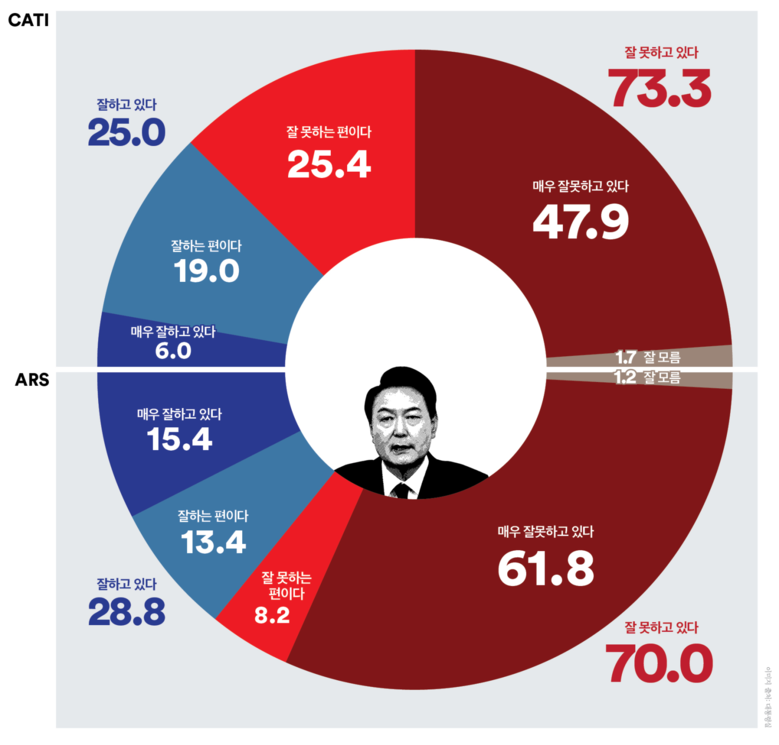 같은 시기에 진행한 ARS조사 결과 ‘긍정’평가는 2.2%p 하락한 28.8%, ‘부정’평가는 1.9%p 상승한 70.0%로 집계되어 41.2%p의 격차를 보였다. 호남권에서 3.2%p 상승했지만 서울(6.6%p↓), 충청권(3.7%p↓), 부·울·경(2.9%p↓)등에서 ‘긍정’평가가 하락했다. ‘부정’평가는 호남권 83.5%, 부·울·경 71.8%, 경인권 71.7%을 비롯, 모든 지역의 ‘부정’평가가 60%를 넘기며 전 권역의 ‘부정’평가 우세가 유지되었다. 연령별로 보면 70세 이상만이 유일하게 ‘긍정’평가 상승, ‘부정’평가는 하락하며 지난 주에 이어 70세 이상만이 ‘긍정’평가 우세를 보였다. 중도층은 ‘긍정’평가 2.3%p 하락, ‘부정’평가는 2.0%p 상승하며 ‘긍정’평가 25.4%, ‘부정’평가 74.0%를 기록, 48.6%p의 격차를 보였다. 이는 2023년 1월부터 누적해온 조사 결과 중 중도층 ‘긍·부정 격차가 가장 크게 나타난 것이다.