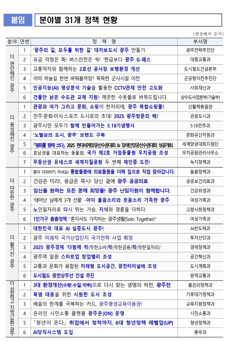 선정된 주요 스타정책으로는 ▲‘광주의 길, 모두를 위한 길’ 대자보 도시 광주 만들기 ▲요금 걱정은 뚝! 버스안전은 쑥! 광주 G-패스! ▲관광과 여가 그리고 문화, 쇼핑이 한자리에 광주 복합쇼핑몰! ▲민주·문화·미식·스포츠 도시로의 초대! 2025 광주방문의 해! ▲통합돌봄에 의료돌봄을 더해 집으로 직접 찾아갑니다 ▲건강은 미리! 응급은 즉시! 당신 곁에 광주 공공의료 ▲1인가구 촘촘정책 ‘혼자서도 가치하는 광주생활(Solo Together)’ ▲교통과 문화가 융합된 미래형 도시공간, 광천터미널에 조성 ▲2025 ‘광주경제 다함께 착(착한소비) 착(착한금융) 착(착한일자리)’ ▲폭염 대응을 위한 시원한 도시 조성 ▲‘청년이 온다’ 취업에서 정착까지, 6대 청년정책 레벨업(UP) 등으로 민생과 미래를 아우르는 다양한 정책들이 선정됐다.