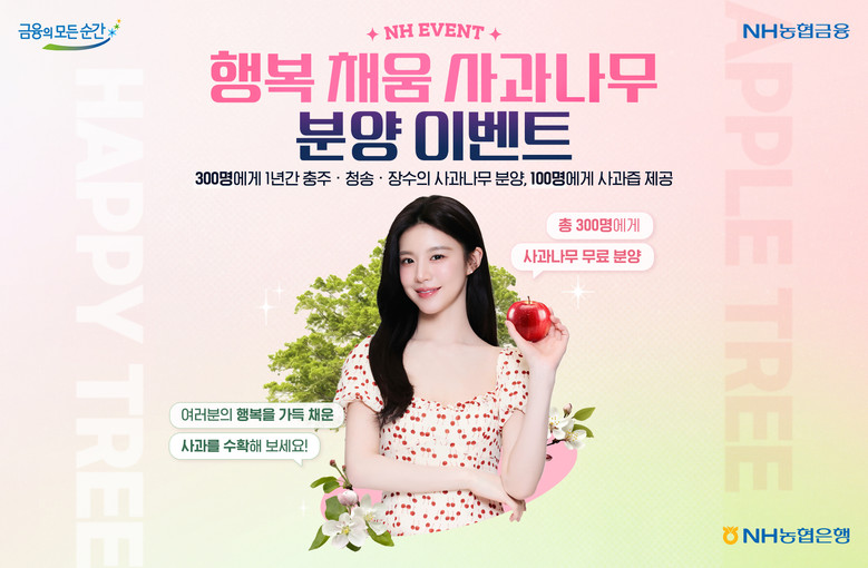 행복이 가득 찬 나만의 이야기와 방문 희망 지역을 농협은행 페이스북 또는 인스타그램에 댓글로 작성하면 추첨을 통해 300명에게 사과나무를 1년간 분양하고, 100명에게는 사과즙을 제공한다.