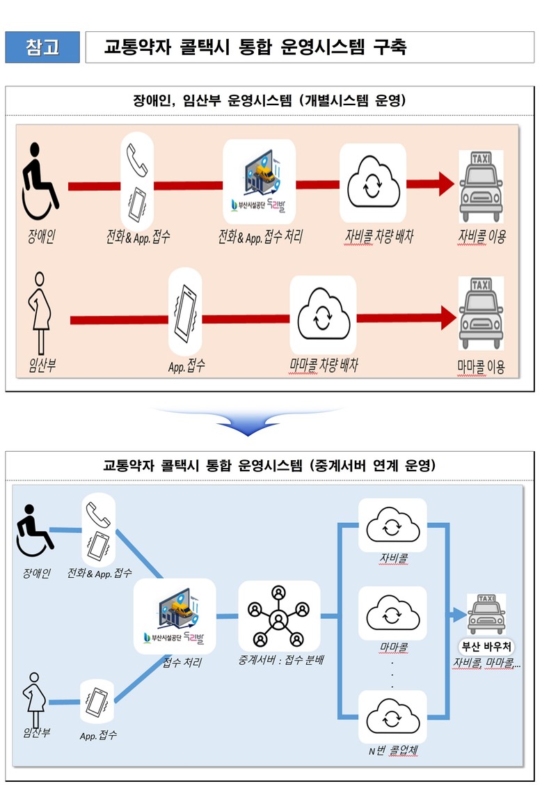 시는 장애인, 임산부 등 교통약자의 이동 편의성을 향상하고 콜택시 운영의 효율성과 최적화를 도모하기 위해 현행 개별시스템 구조를 하나로 통합 확대 운영한다.