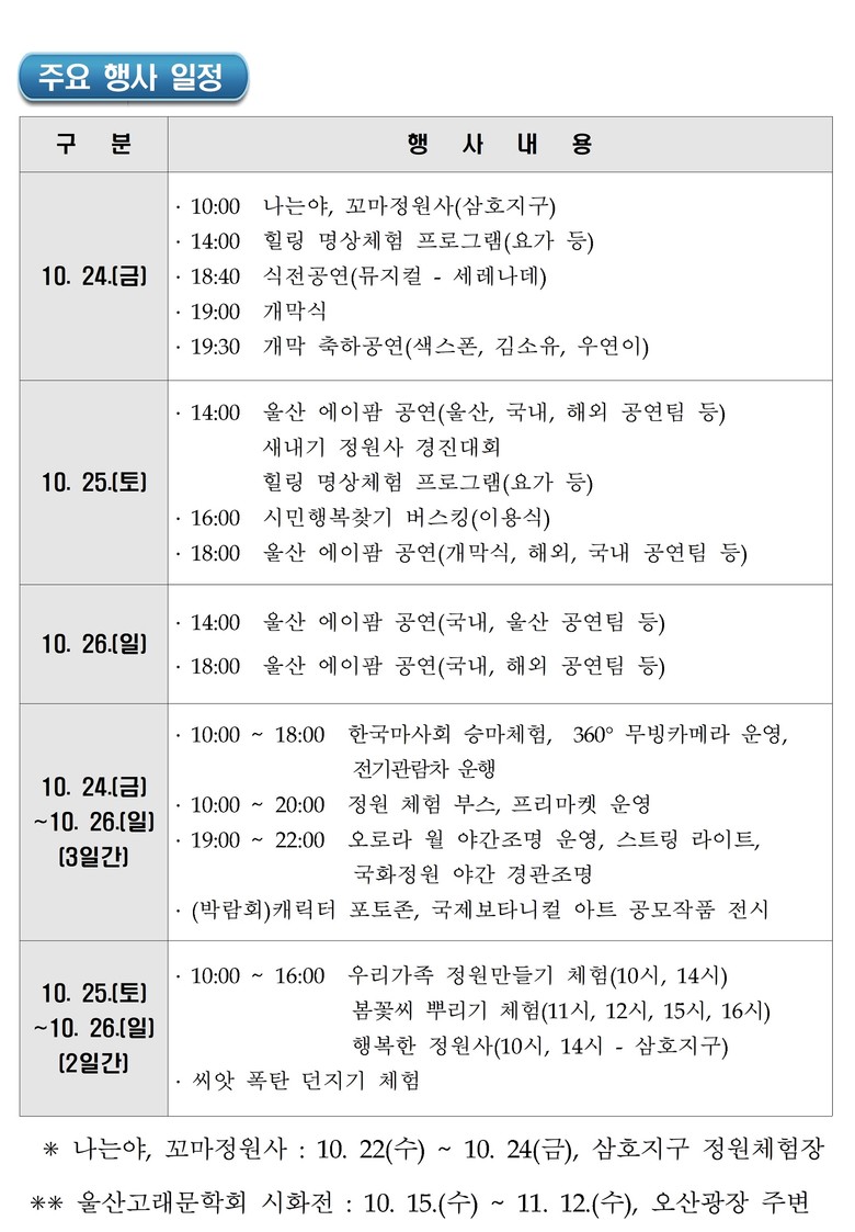 24일~26일, 우리가족 정원만들기, 봄꽃씨 뿌리기 등 행사 풍성 [울산 세계타임즈=이호근 기자] 울산시는 오는 10월 24일부터 26일까지 태화강 국가정원 일원에서 ‘바람이 머무는, 가을정원’이라는 주제로 ‘2025 태화강 국가정원 가을축제’를 개최한다고 밝혔다.