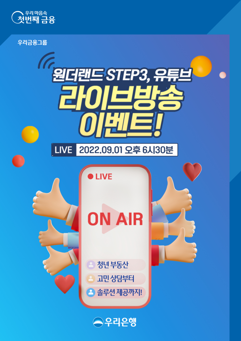 우리은행 관계자는 "지난 6월부터 선보였던‘원더랜드 성장기’가 청년 고객들의 많은 관심을 받아, 직접 고객들과 소통 하기 위해 이번 방송을 기획하게 되었다”며, “앞으로도 더 알차고 정확한 정보로 고객들의 성원에 보답하겠다”고 말했다.