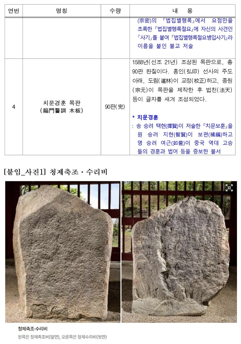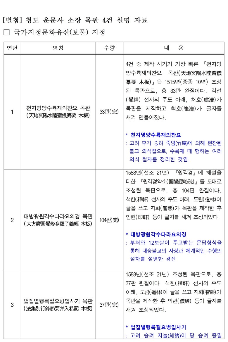 또 이번에 함께 지정된 ▴청도 운문사 소장 목판 4건(천지명양수륙재의찬요, 대방광원각수다라요의경, 법집별행록절요병입사기, 치문경훈 목판)은 지역 사찰 소장 목판 중 완전성, 제작 시기, 보존 상태, 희소성 등을 종합적으로 판단해 지정됐다.