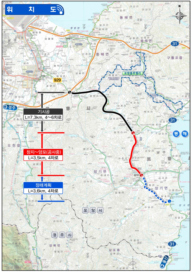 배용수 경상북도 건설도시국장은 “지방도 929호선의 확장과 관련해 조정·중재를 위해 노력한 국민권익위와 협소한 도로로 인해 통행에 불편을 겪으면서도 국가안보를 위해 군(軍)에 대한 배려와 이해를 아끼지 않은 장기면 주민들에게 감사드린다”며 “장기면 소재 지방도 929호선이 4차로로 전면 확장이 되면 주민들의 안전한 통행 편의뿐만 아니라 관광객 유입으로 지역 경제 발전의 밑거름이 될 것으로 기대된다”고 말했다.