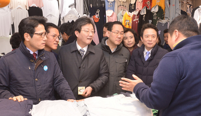 바른정당 정병국(왼쪽부터) 대표, 정운천 최고위원, 유승민 의원, 주호영 원내대표, 박순자 최고위원, 남경필 경기도지사가 9일 오전 서울 중구 테크노상가를 찾아 상인과 이야기를 나누고 있다. 이날 바른정당 정병국 대표, 주호영 원내대표, 유승민 의원, 남경필 경기도지사 등 의원들은 전안법( 전기용품 및 생활용품안전관리법)과 사드보복으로 위기를 맞은 동대문 패션타운 테크노상가를 살펴보고 식당에서 상인들과 식사를 하며 간담회를 가졌다. 2017.03.09.