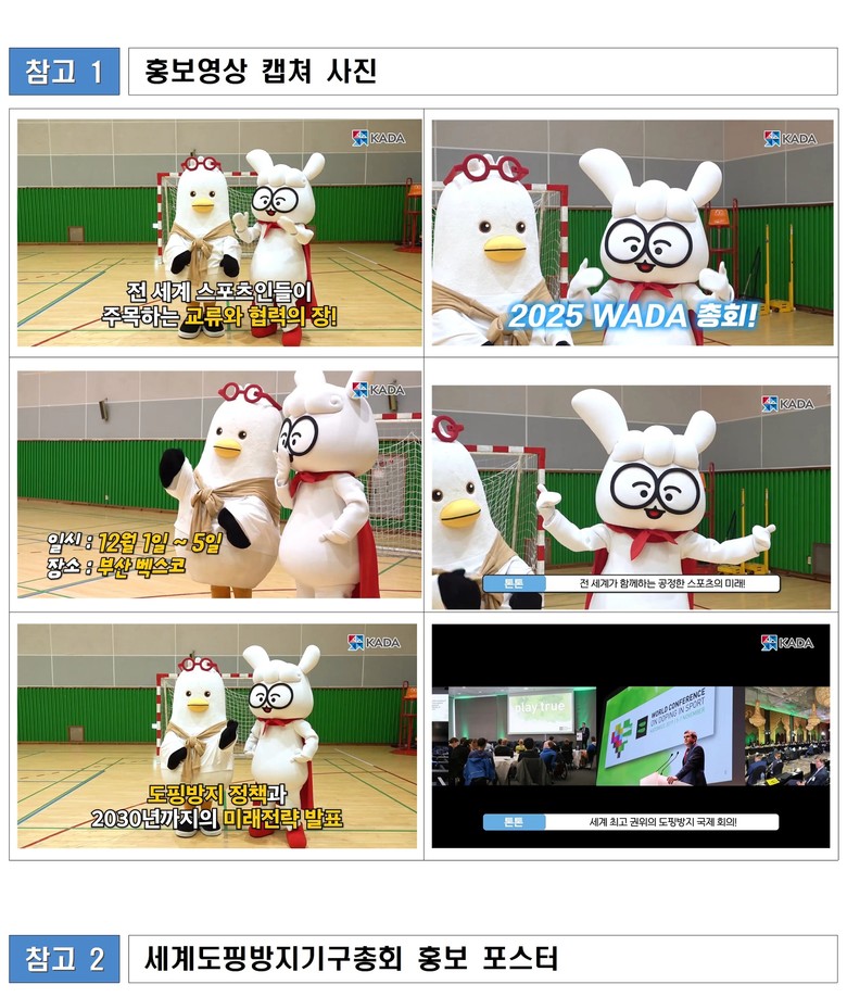 ○ [사전 홍보영상] 오늘(11월 3일)부터 양 기관의 공식 캐릭터 ‘부기’와 ‘톤톤’이 함께한 유튜브 홍보영상을 각 기관 유튜브 채널을 통해 공개한다. 이번 영상은 벡스코, 사직야구장, 부산시체육회 월계관 등 주요 스포츠 현장을 배경으로 총회와 도핑방지의 중요성을 유쾌하게 전달한다.
