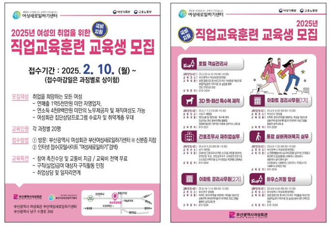 접수 일정은 과정별로 상이하며, 자세한 사항은 여성회관 교육복지팀(☎ 051-610-2014) 또는 부산새일센터(☎ 051-610-2031)로 문의하면 된다.