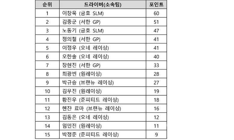 현재까지의 시즌 종합 1위는 금호SLM의 이창욱이다. 올 시즌 전 라운드에서 폴포지션을 차지하며 타임 트라이얼의 절대 강자로 떠오른 그는 4라운드에서는 차량 트러블로 리타이어해 무득점에 그쳤다. 그러나 정상적인 차량 상태였다면 포디움이 유력했다는 현장 평가도 있는 만큼, 이번 5라운드에서 다시 존재감을 드러낼 가능성이 높다. 팀 동료 노동기 역시 꾸준히 포디움에 오르며 팀 포인트에 크게 기여하고 있다.