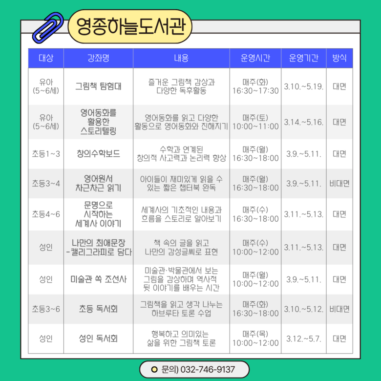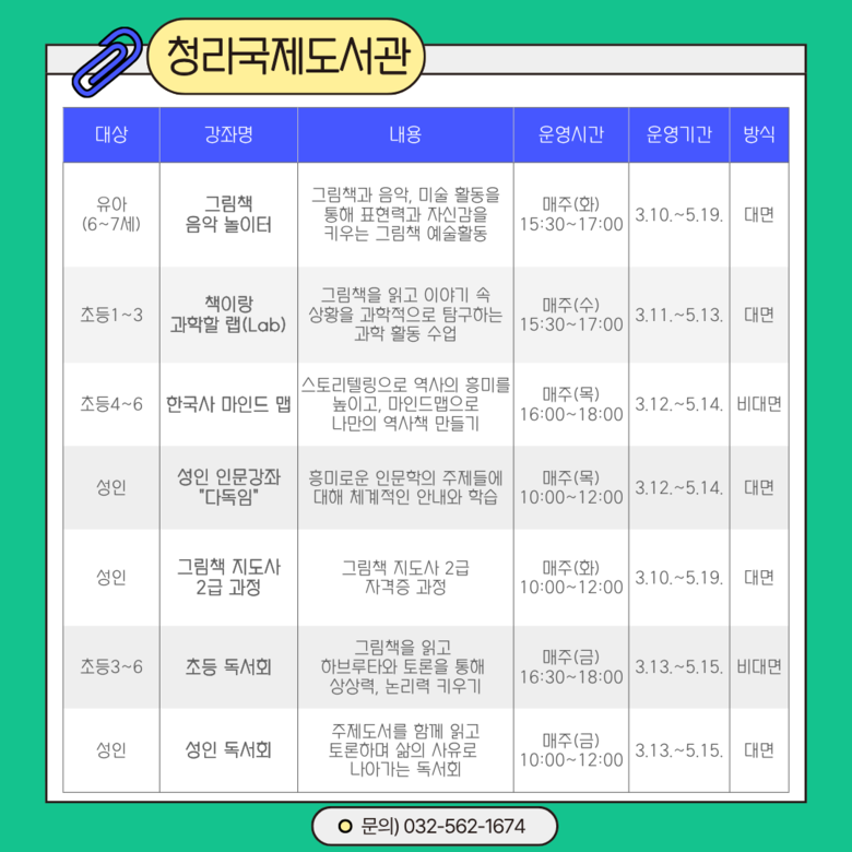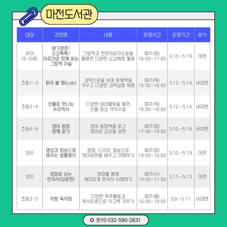 이번 상반기에는 총 43개 강좌가 운영된다. 도서관별로는 ▲인천도서관 ‘그림책 꽃이 피었습니다’등 10개 강좌 ▲청라호수도서관 ‘북북 탐정단-책으로 문제를 해결하라’ 등 10개 강좌 ▲청라국제도서관 ‘책이랑 과학할 랩(Lab)’ 등 7개 강좌 ▲영종하늘도서관 ‘창의수학보드’등 9개 강좌 ▲마전도서관 ‘영어 동화 함께 읽기’ 등 7개 강좌를 마련했다.