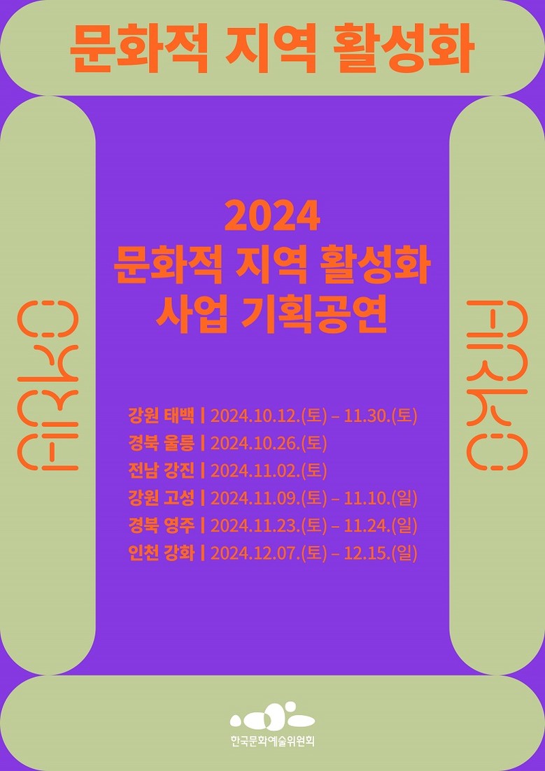 본 공연은 예술위가 소멸 위기 지역인 강원 고성, 강원 태백, 인천 강화, 전남 강진, 경북 영주, 경북 울릉 6곳을 선정해 공동으로 추진하고 있는 2024 소멸 위기 대응 문화적 지역 활성화 사업의 일환으로 열린다. 이 사업은 소멸 위기에 처한 지역에서 문화예술을 활용해 거주 여건을 개선하고 삶의 만족도를 높여 인구감소 위기를 완화시키고자 마련됐다.