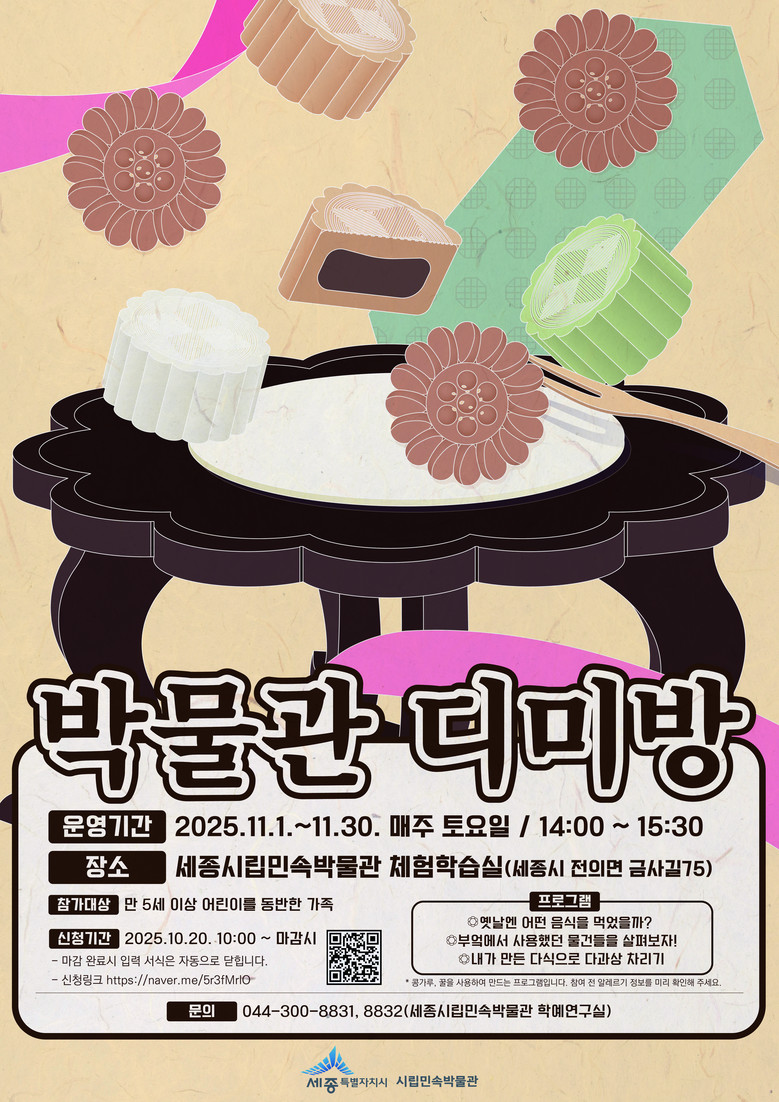 프로그램 관련 문의 사항은 세종시립민속박물관 학예연구실(☎044-300-8831, 8832)로 전화하면 된다.