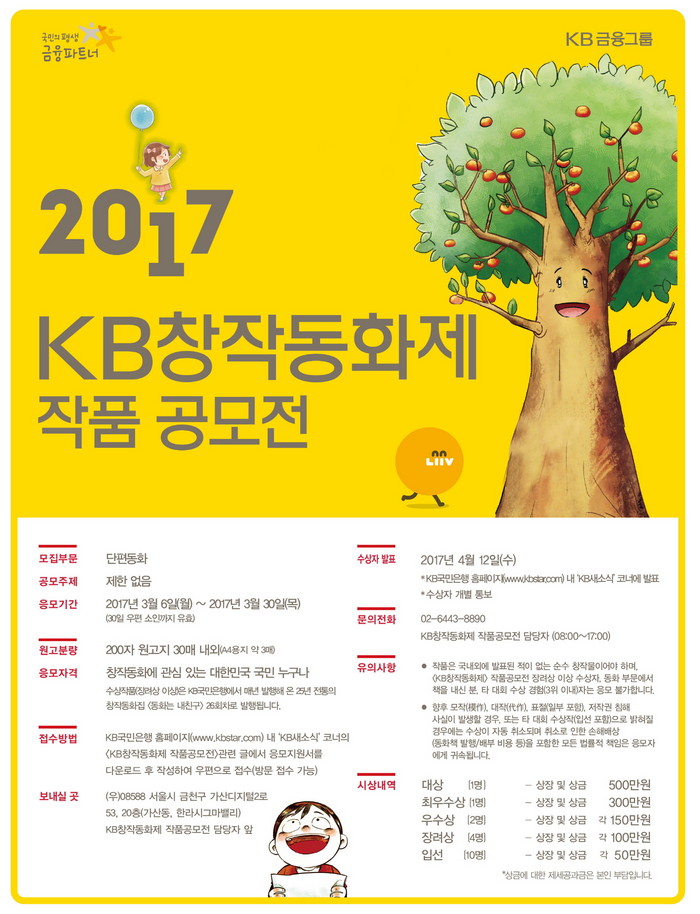 이에 KB국민은행 관계자는 “공모전 당선작(장려상 이상)은 KB국민은행이 매년 발행해 온25년 전통의 KB창작동화집 <동화는 내친구>에 등재될 예정으로, 올해도 어린이들에게 꿈과 희망을 심어줄 수 있는 재미있고 따뜻한 우수한 작품이 많이 응모되기를 기대한다”고 말했다.