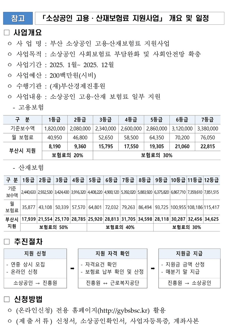 고용보험과 산재보험에 가입한 부산 소상공인이면 누구나 이번 사업에 지원 신청할 수 있다. 온라인 공식 누리집(gybsbsc.kr)을 통해 상시 접수 중이며, 이후 자격 검증을 거쳐 기존보수 등급별로 보험료를 지급할 예정이다.