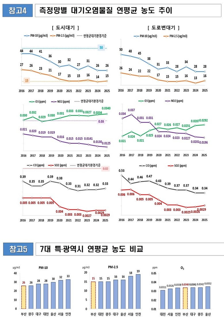 이번 결과는 부산시가 ▲미세먼지 계절관리제 시행 ▲항만 대기질 개선 협력 ▲도로 재비산먼지 저감사업 ▲무공해차 보급 및 충전 인프라 구축 등 지역 특성을 반영한 배출원별 중점 관리 정책을 지속적으로 추진한 결과로 풀이된다.