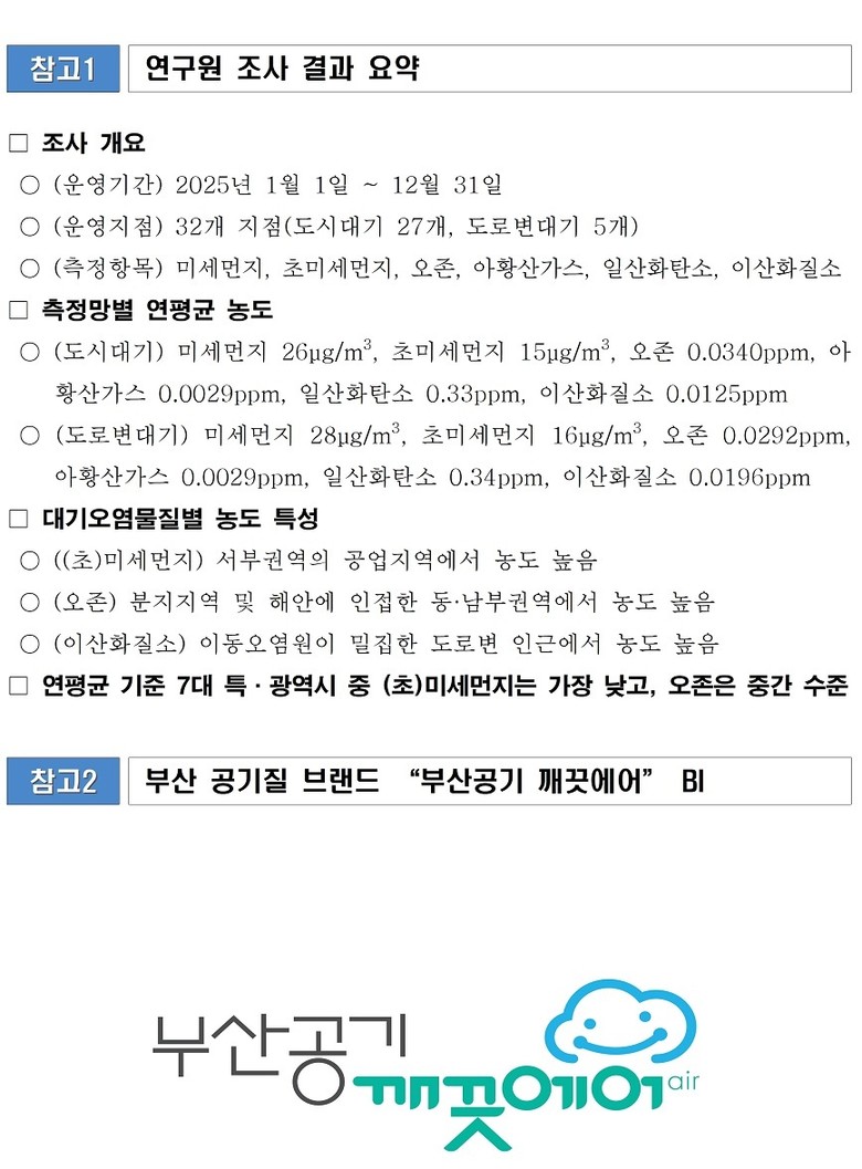 연구원은 대기질 모니터링 및 개선을 위해 부산 시내에 대기환경 측정소 32개(도시대기 27개, 도로변대기 5개)를 운영하고 있으며, 이번 조사에서 대기환경기준 6개 항목(미세먼지, 초미세먼지, 오존, 아황산가스, 일산화탄소, 이산화질소)을 측정하였다.