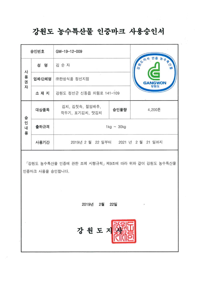 김치전문기업 (주)한성식품(대표이사 김순자) 이 지난해 말 새롭게 오픈한 강원도 정선공장에 대해 ‘강원도 농수산특산물 인증마크"를 받았다고 밝혔다.