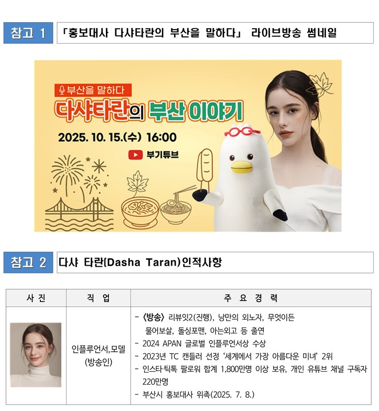 한편, 다샤 타란(Dasha Taran)은 러시아 출신의 유명 영향력자(인플루언서)로 지난 7월 디지털 외국어 메뉴판 홍보대사로 위촉되었으며, 부산 대표 음식과 음식점 메뉴판 제작 플랫폼인 '부산올랭'의 홍보 모델로 참여했다.