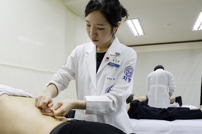 | ▲부천자생한방병원 의료진이 성곡새마을금고 진료소를 찾은 환자에게 침 치료를 시행하고 있다. |
