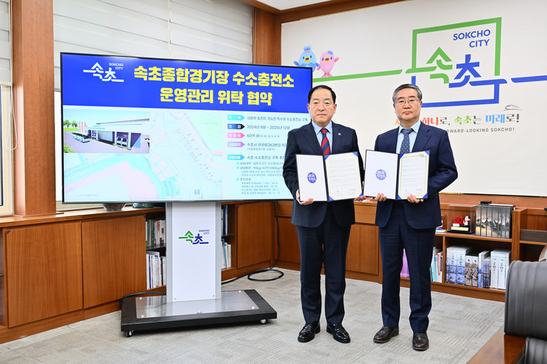 이병선 속초시장과 김태균 속초시시설관리공단 이사장은 3월 28일, 시장 집무실에서 속초종합경기장 수소충전소의 차질 없는 사업 추진을 위해 위탁협약을 체결했다.