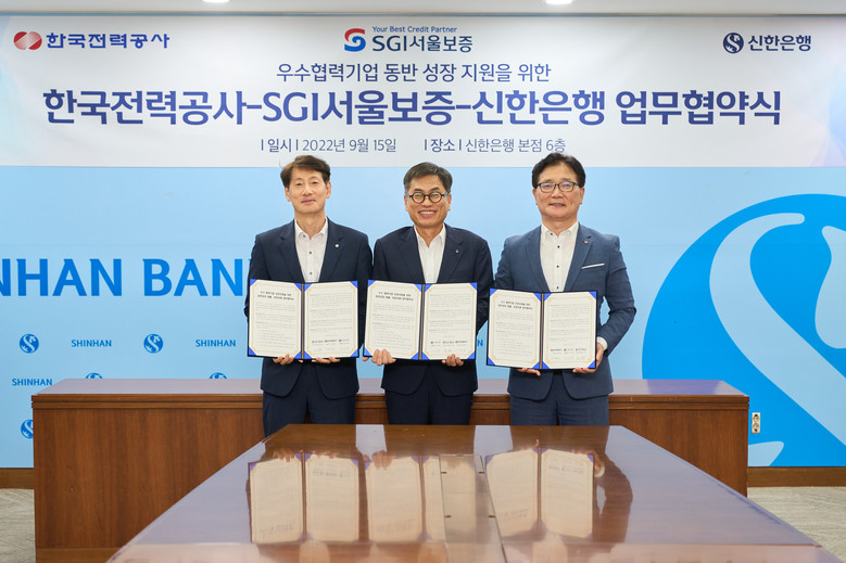SGI서울보증은 15일 서울시 중구 신한은행 본점에서 한국전력공사, 신한은행과 함께 「한국전력 우수 협력기업 동반성장 지원을 위한 업무협약」을 체결했다고 밝혔다.