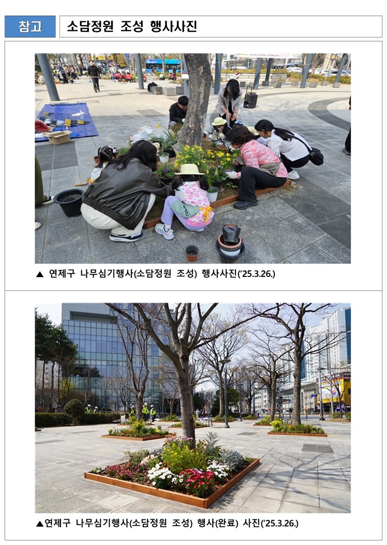 '소담정원'은 '일상의 소중함을 담은 정원'이라는 의미를 담고 있으며, 연제구(3.26.), 사상구(3.27.) 등 시민들의 참여로 행사가 진행됐으며, 수영구 등은 4월 중 행사를 추진할 예정이다.