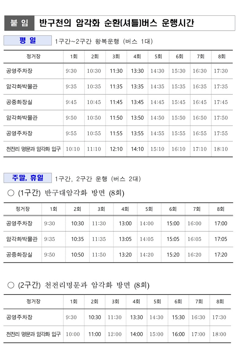 운행 노선은 ▲1경로(코스)(반구대암각화 방면)는 반구대암각화 공영주차장에서 출발해 반구대안길 공중화장실까지 ▲2경로(코스)(천전리 명문과 암각화 방면)는 반구대암각화 공영주차장에서 출발해 천전리 명문과 암각화 입구까지 각각 왕복 운영한다.