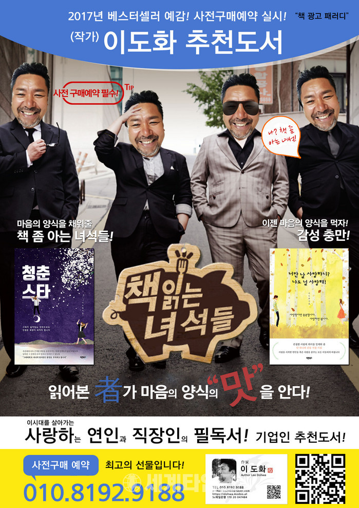 최근 출판사 (바른북스) 에서 출간을 앞두고 있는 시집 너 만 날 사랑하니 나도 널 사랑해! 에세이 청춘스타 두 권의 작가인 이도화씨의 특이한 책 광고가 눈길을 끈다. 작가가 직접 먹 방 방송을 페러디한 책 광고가 페이스 북과 카 톡에서 인기를 끌고 있는 것. 하얀 수염과 동네 아저씨 같은 미소를 짓는 작가의 모습. 먹는 음식과 책을 비교함으로서. 책에 대한 친근감과 기억에 남는 광고 효과를 톡톡히 보고 있다.