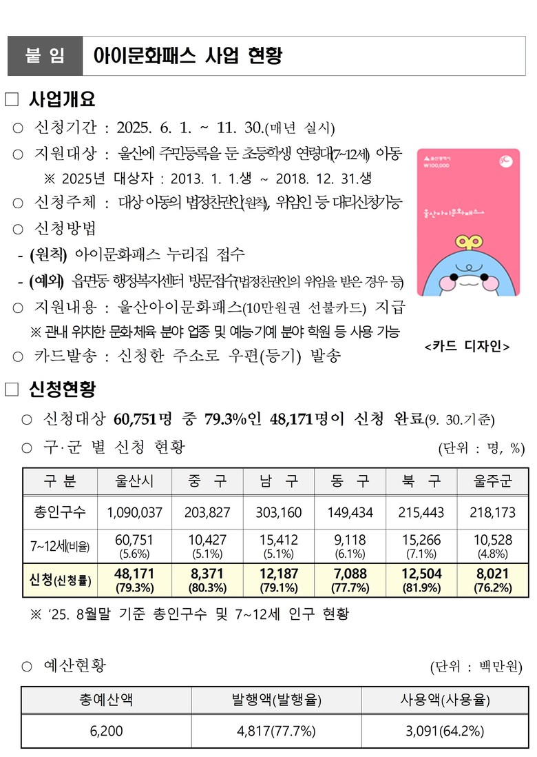 미발급자는 오는 11월 30일까지 울산아이문화패스 공식 누리집(www.ulsan.go.kr/i-culture/)에서 신청 가능하며, 카드 사용기한은 12월 20일까지이다.